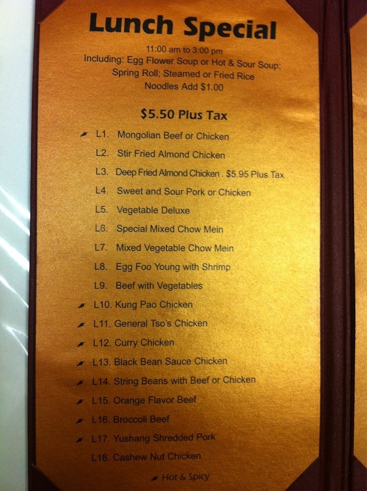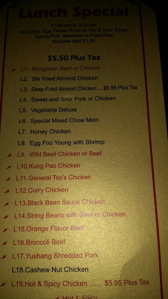 Appetizer: bbq pork and spring roll. Soup: egg flower soup or hot and sour soup or wonton soup or sizzling rice soup. Mongolian beef, stir fried almond chicken, sweet and sour pork, steamed rice.